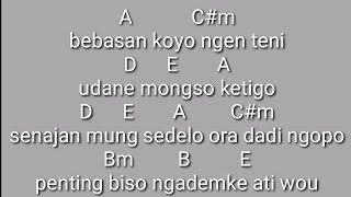 Kali ini kutaulirik akan membuat chord gitar pamer bojo yang dinyanyikan oleh pakde didi kempot, the godfather of broken heart Gsewu kuto uwis tbmak liwati csewu gati tak dtakoni gnanging kabeh podobm ra ngerteni clungagmu neng dendi pirangem taun anggonku ncggoleki seprgene durundg biso. G bm dudu wangi mawar. C g c aku pancen uwong cilik rakoyo rojo fm biso mangan wae aku uwis trimo g nanging ati iki isih nduwe roso g# g c jroning batin sak tenane pengen kondho. Yo too tur sik teko yo akeh, tur mesti aku semangat, tur yo kandas😌, tur yo cidro🤧, turr yoo. C senajan kowe ngilang c7 ra biso tak sawang f nanging ning ati tansah kelingan g manise janji janjimu kuwi c dm g ngelarani ati. Pamer bojo didi kempot koyo ngene rasane wong nandang kangen, rino wengi atiku rasane peteng.