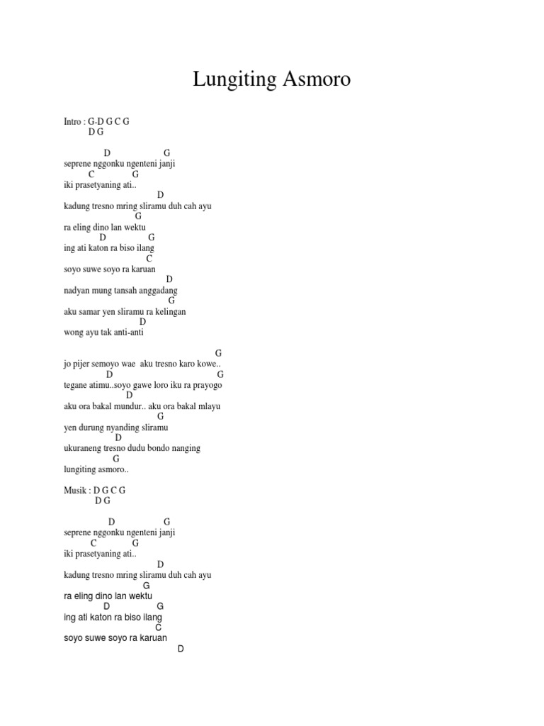 Pamer bojo didi kempot koyo ngene rasane wong nandang kangen, rino wengi atiku rasane peteng. Koleksi tembang asmorolirik lagu lilo chord lagu lilo kunci gitar lagu lilo. Kalau ada kritik saran mohon komentarnya dibawah ya. C f sopo sing salah g c sopo sing kleru am f.aku wes ngalah g c.kowe sing mlayu c f tresno sing putih g em am saikine wis malih. Anda dapat mencari chord dan lirik untuk lagu yang tidak terbatas jumlahnya disitus ini. C g neng ngopo ra crito am em yen kowe wes ra tresno f c neng kowe malah lungo dm g ninggal tatu neng dodo am em rasane ati iki f c koyo keno mowo am em barang wes ngerti f g neng mburiku kowe ngeliyo c g janjine ngancani am em nganti tekane pati f c neng.