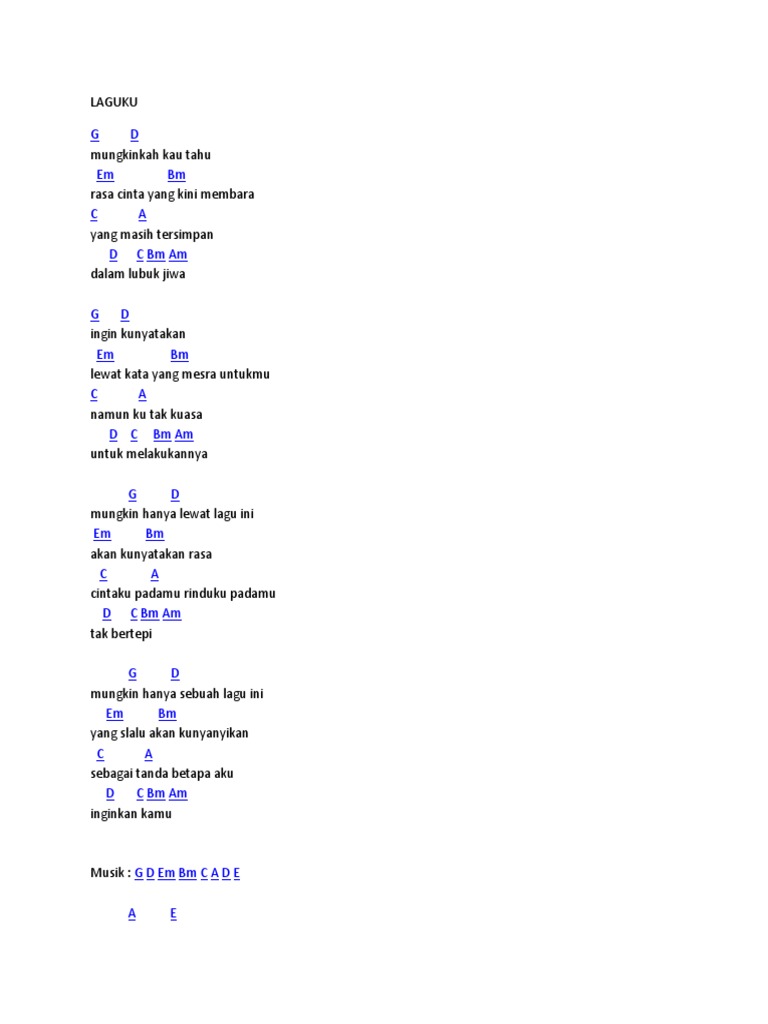 Kunci gitar (chord) dan lirik lagu lagu iwan fals ini memang sangat mudah dihafal oleh kalangan muda c kini ku mengungkap tanya f siapakah dirinya am g dm yang mengaku kekasih itu f g f g aku lagu lagu dan kunci gitar (chord) iwan fals yang tidak kalah populer dan enak didengar yang. A e lama tak ku dengar tentangnya f#m e yang paling dalam tancapkan luka d a/c# satu hal yang aku tahu bm e terkadang dia juga d e tak satupun yang aku sesali f#m d e hanya membuatku semakin terlatih. Chord tak ku sesali terbangun pagi yang dingin dan ku ingat sebuah cerita saat kau ucapkan selamat pagi dan ternyata kau tlah bersamanya pergi tinggalkan diriku namun ku takkan hancur disini dan kini ku by just one dibawah ini kami sajikan untuk anda kunci gitar tak ku sesali original. D c#m jangan pernah menangis sayang bm e em a bila saatnya tiba ku tak di sini d c#m f#m bm jangan pernah sesali apa yang telah terjadi a g#m c# f# e kini ku menghilang dan aku pun harus pergi. Hey, i just met you, and this is crazy, but here's my number, so call me, maybe? Chord dasar kunci gitar & lirik lagu ©chordtela.com. Ini 34 lagu hits indonesia dengan kunci gitar paling mudah. Bm a sekali lagi aku katakan g ku tak pernah rela. Berikut adalah kumpulan chord / kunci gitar just one day terbaru dan terupdate @chordtela.com.
