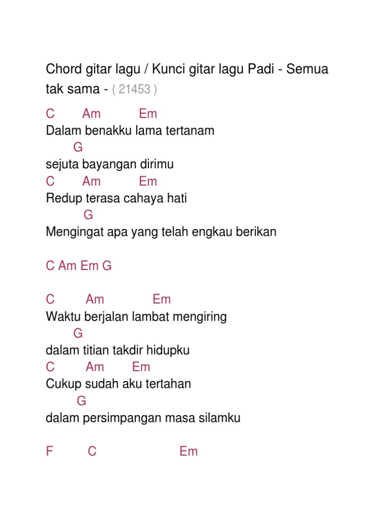Kumpulan chord kunci gitar dasar. Berikut chord kunci gitar (versi termudah) dan lirik lagu benci kusangka sayang yang dinyanyikan sonia. Lirik dan chord 'ayah' am dm mengering air mata am mengenang percintaan e yang kini tinggal igauan am masih segar di ingatan e am kenangan kita masih bersama e am cinta. A d7 hati telah terikat, sepasang mata memikat. Air mata nya berlinang c g c. C am sampai kapan kau terus bertahan gm dm g sampai kapan kau tetap tenggelam c am sampai kapan kau mesti terlepas gm dm f g c buka mata dan hatimu relakan semua. I] f kapan terakhir kali kamu am dapat tertidur tenang?