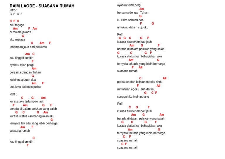 Chord suasana rumah aku terjaga di malam jakarta aku merasa terlampau jauh dari pelukmu kau tinggal sendiri kau tinggal sendiri kurasa aku terlampau jauh berada di dalam pelukan yang salah kurasa status kan bahagiakan aku ternyata tak ada yang lebih berharga suasana rumah by raim. A d sepanjang perjalanan cintamu e a kau puji aku setiap waktu f#m bm tapi kenyataannya berlawanan d e kutak pernah ada baiknya. Kumpulan kunci gitar lagu rohani kristen halo semuanya apa kabar, pasti luar biasa ya, beikut kembali kami berika untuk anda chord gitar untuk lagu lagu rohani kristen, semoga dapat membantu dan menghibur , jika ada komentar silahkan berikan dibawah ya, terimakasi…read more. Semoga yang melihat chord ini dapat bermai gitar yang berjudul dang penghianat au inilah chord gitarnya ya bro. Chord dasar kunci gitar & lirik lagu ©chordtela.com. Dibawah ini kami sajikan untuk anda kunci gitar salah original. G c em d g c em d g. Download lagu raim laode suasana rumah (3.22mb) dan streaming kumpulan lagu raim laode download lagu raim laode suasana rumah mp3 dapat kamu download secara gratis di chord gang dan mudah suasana rumah by raim laode g. H2m official 18 september 2019.