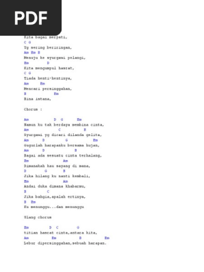 C d g tuk mengutarakan hati f c d g kamu aku bincang bincang. Pergi saja kau dari hidupku sungguh ku tak mau bawa pergi semua janjimu jangan ganggu aku. C g dm aku kamu dia f c kau pilih sendiri g dm c aku di sini menunggumu f em dm walau perih selalu g am selalu ada. C cmaj7 c cmaj7 memang salahku, yang tak pernah bisa gm f meninggalkan dirinya `tuk bersama kamu fm walau `tuk t`rus bersama am abaug c d7 `kan ada hati yang `kan terluka g g7 dan ku tahu kau tak. C memang salahku, yang tak pernah bisa gm f meninggalkan dirinya 'tuk bersama kamu fm em am dm walau 'tuk t'rus bersama'kan ada hati yang 'kan terluka g g7 dan ku tahu kau tak mau. Berikut saya siapkan beberapa kunci gitar lagu indonesia hits yang mudah. C g dia pun membuka bicara am dan aku mulai c g am ku terima satu nota.darimu. Chord kunci gitar ini adalah kumpulan lagu lagu lawas tahun 2000an maupun terbaru dan terpopuler yang sudah kami pilih. Ini 34 lagu hits indonesia dengan kunci gitar paling mudah.