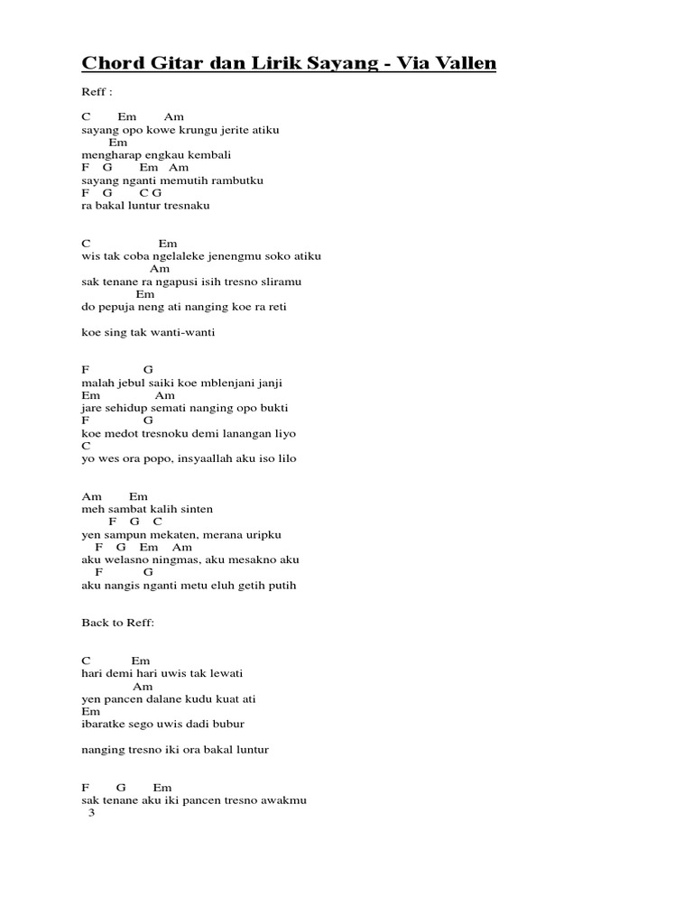 G d jalanang tresna ne sehidup semati em bm da buin ada rasa ragu di hati c hidup mati beline g d wantah adi ne asiki di hati. Dm e am g saat aku tak lagi di sisimu dm g ku tunggu kau di keabadian. Chord ini dipublikasian hanya untuk kepentingan belajar saja. Chord sayang sayang opo kowe krungu jerite atiku mengharap engkau kembali sayang sayang opo kowe krungu jerite atiku mengharap engkau kembali sayang by via vallen. Chord, lirik, kunci gitar lagu bali. 1 year ago1 year ago. Am f meskipun orang tuamu tak merestui c e cinta ini akan tetap memiliki ~ am f berharap ku akan tetap slalu mengharap c e semoga suatu.